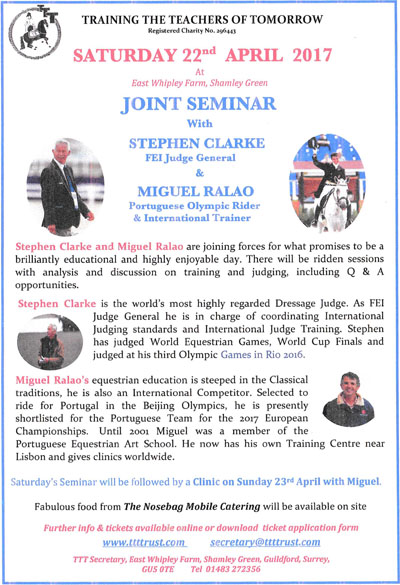 Sunday evening 12th March - Charles will be giving a lecture demonstration on 'The correct use of the leg, seat and rein - The riders tool kit.